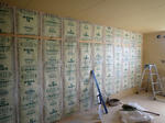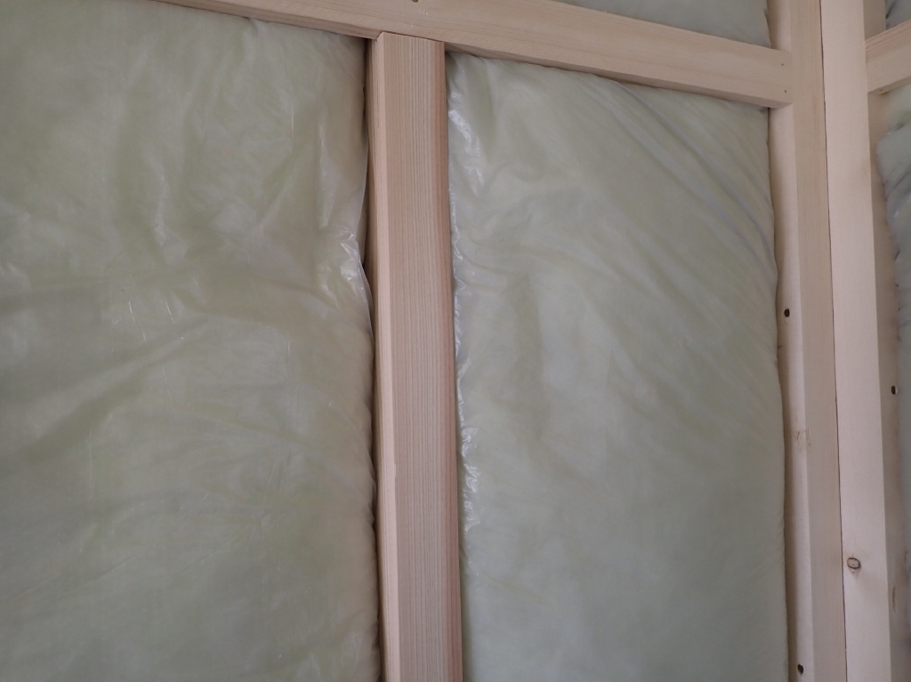 前回は、40mm厚のパネルの骨組みに50mmのHGW16kを充填し、付加した65mmの間柱にも50mmのHGW16kを充填して、0.2mmの防湿シートを施工しましたが、今回は予算の都合により袋入りGW90mmを、前回と同じ軸組構成に充填していきます。