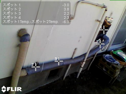 スポット1~3はサドル部分の温度を指示しており、スポット4は屋内に入る部分に配管の為に開けた外壁の穴を隠すステンレス製の板です。