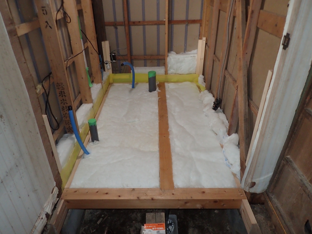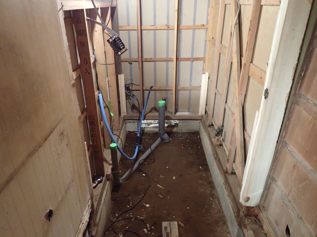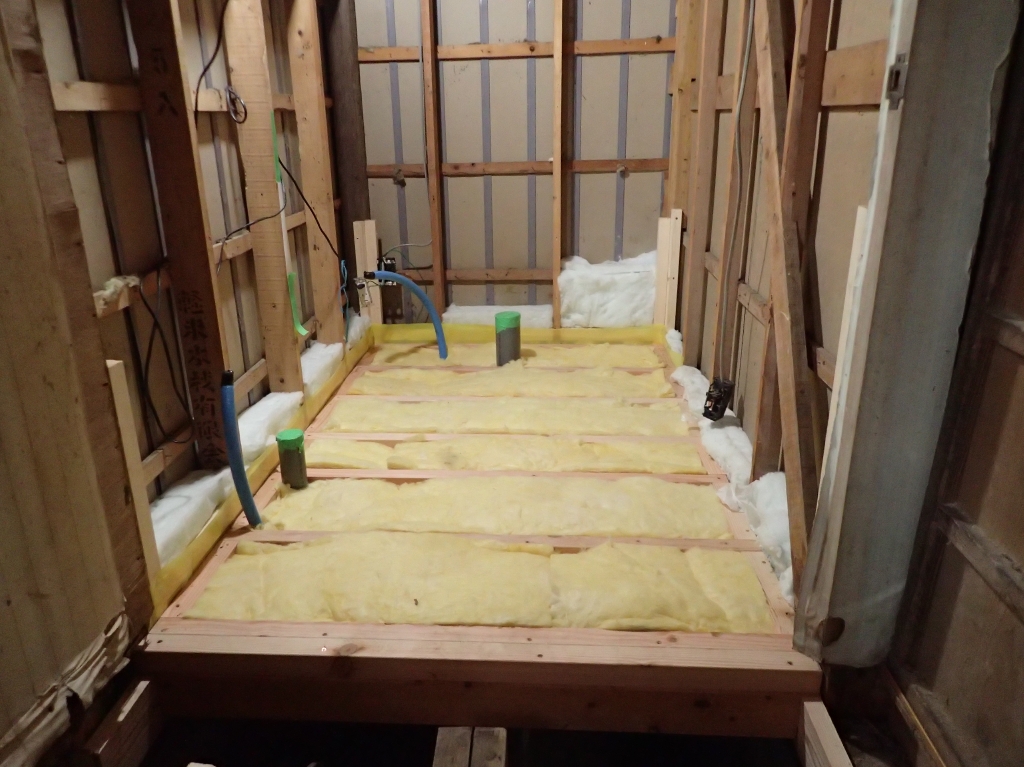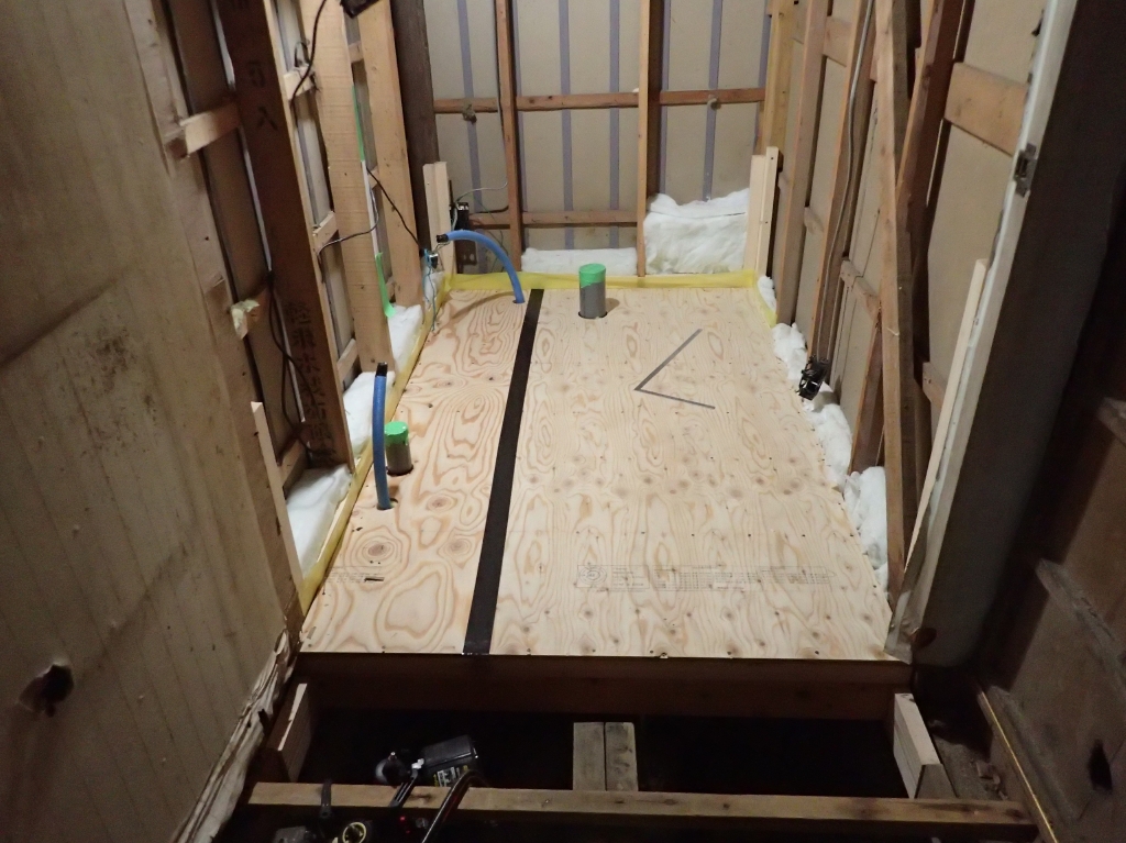 天井、床共に無断熱で、驚いたことに床束が9尺(2,730mm)の間なく(通常は910mm間隔)、更には和便器の所で大引が切断されて、床束で支えられることもありませんでした。
