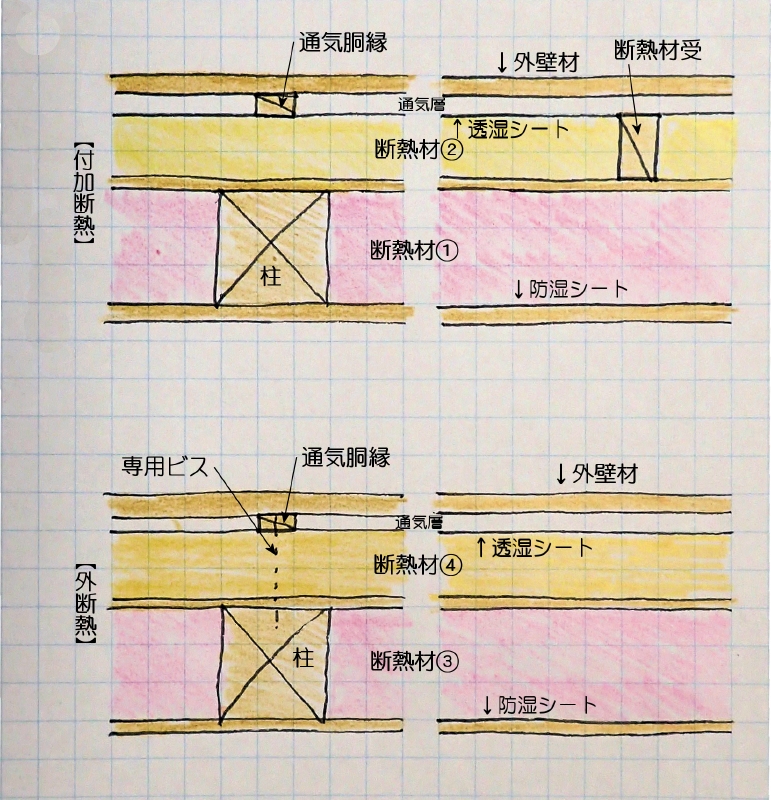 『充填断熱 + 外断熱」と『充填断熱 + 付加断熱』を、図にしてみました。